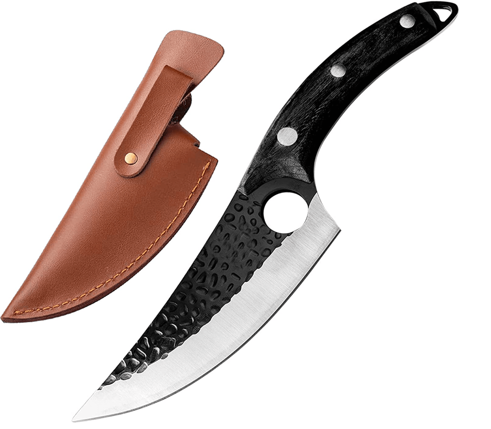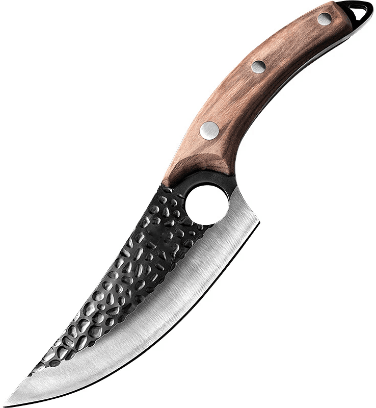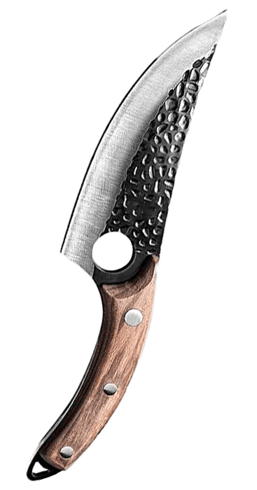 The finger hole provides a secure grip for excellent control. Special hammered dimples on the surface of blade enhanced non-stick properties and it also makes the knife look awesome.