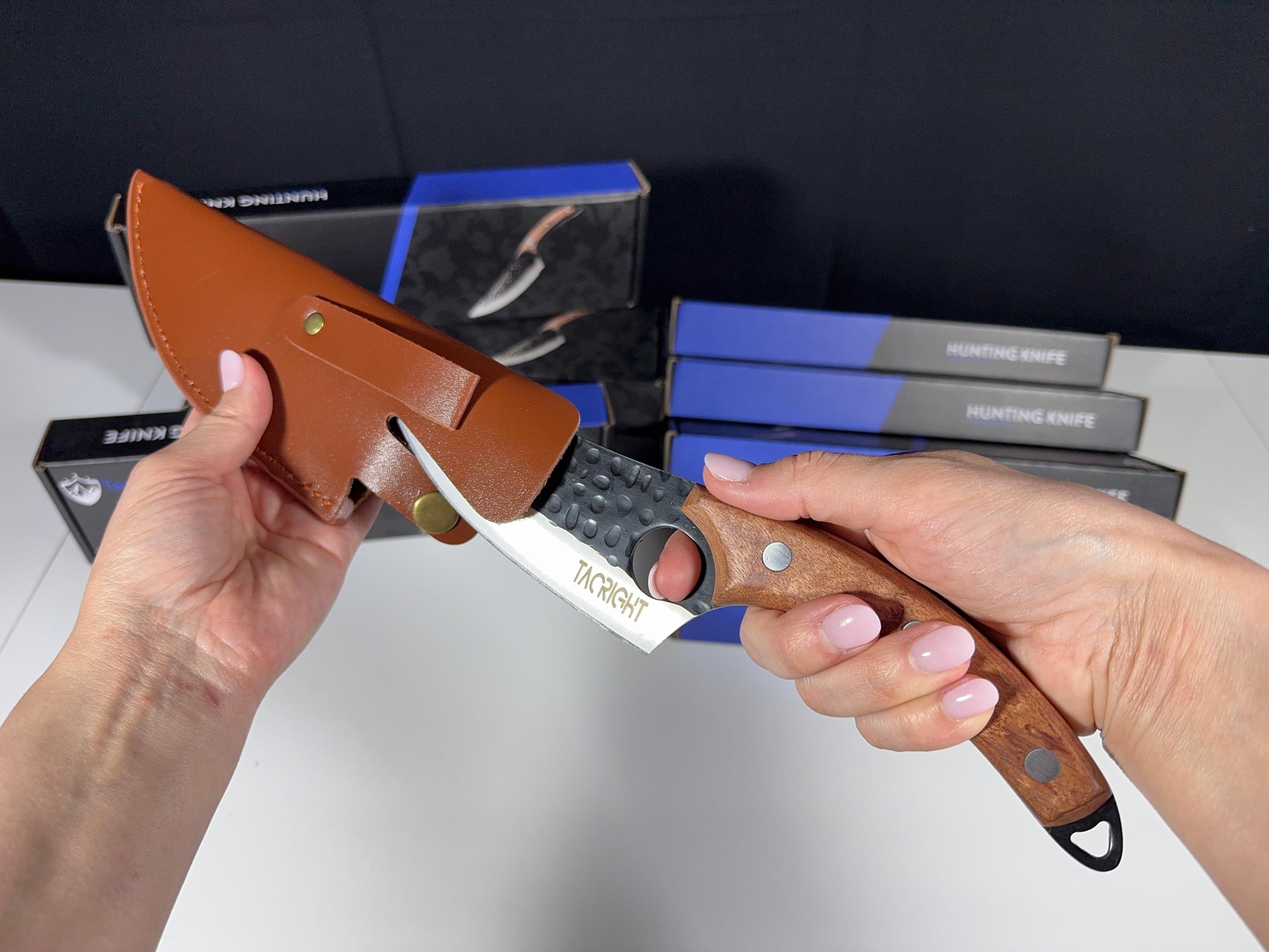 Equipped with a portable soft leather sheath, which is suitable for camping, hiking, barbecue party. You can wear a sharp knife and never increase your load.